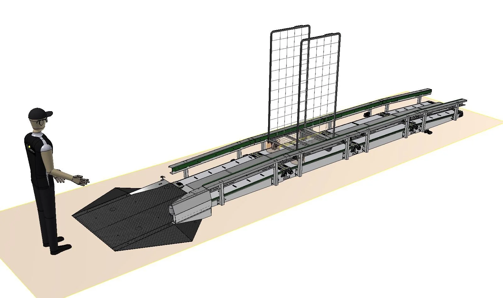 Het walking‑chainsysteem werkt vergelijkbaar met het molsysteem en maakt gebruik van een horizontaal rondlopende ketting met een meenemer die rolcontainers soepel naar het einde van de baan duwt; zodra de voorste container daar is aangekomen, of wanneer de invoeroperator dit aangeeft, worden de volgende ingevoerde rolcontainers of dolly’s automatisch opgehaald, wat zorgt voor een efficiënte, continue doorstroming met minimale handmatige handelingen.