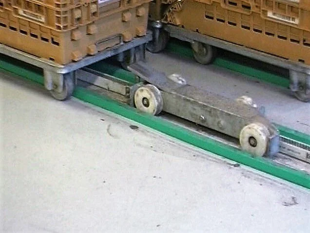 Het Mol‑systeem van Moderniek transporteert rolcontainers volledig automatisch over grote afstanden. Een zelfrijdend doordrukmechanisme beweegt zich tussen de loopwielen door en duwt de volledige rij containers gecontroleerd vooruit, waardoor grote aantallen snel en met minimale fysieke inspanning kunnen worden verplaatst. Dankzij deze robuuste en eenvoudige techniek is het Mol‑systeem bijzonder geschikt voor lange, rechte trajecten waar een krachtige en uiterst betrouwbare transportoplossing vereist is.