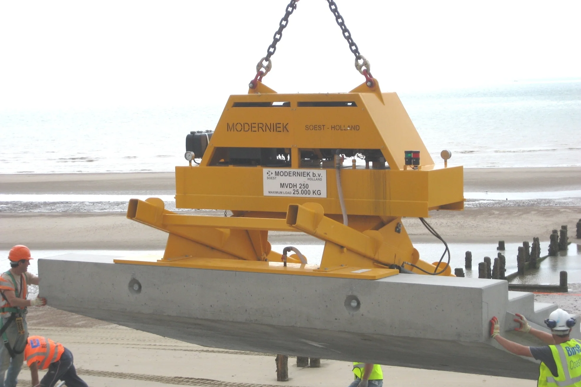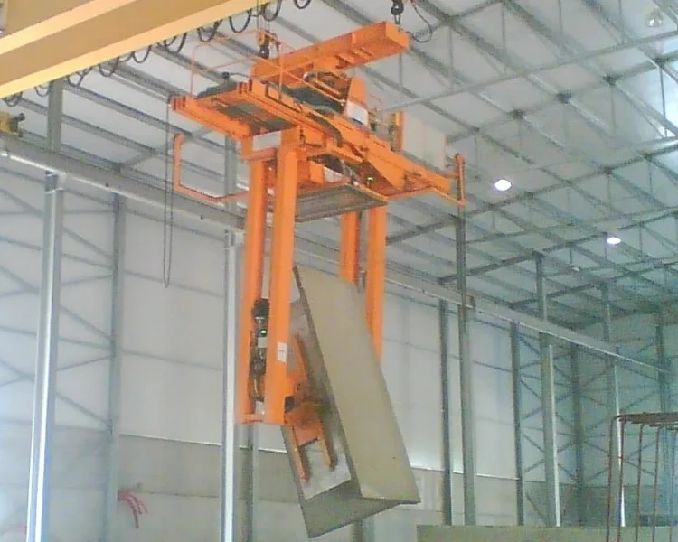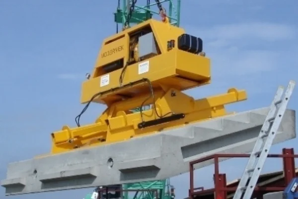 Voor het kantelen van prefab elementen buiten of op locatie heeft Moderniek een hijsbandenkantelaar ontwikkeld. De elementen worden eenvoudig middels hijsbanden geheven en 180 graden gekanteld en is voorzien van zwaartepunts verstelling.